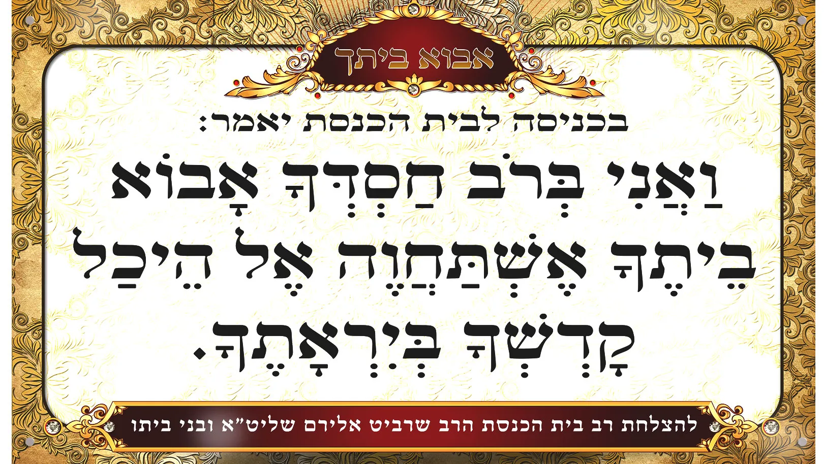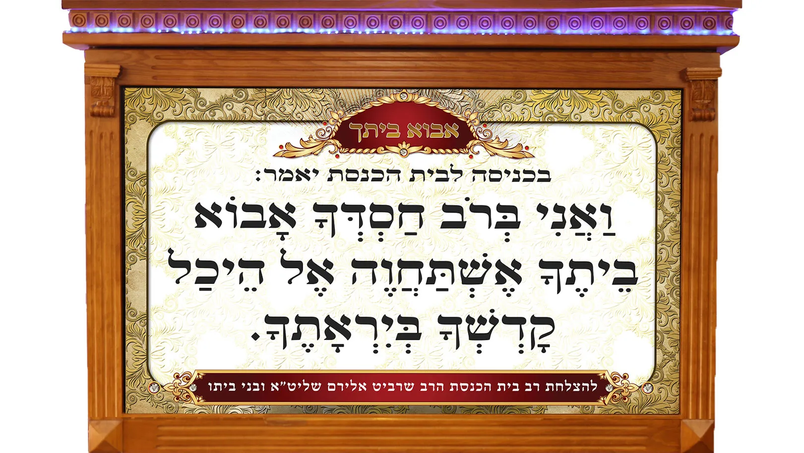 שלט ברוב חסדך מואר מדהים, עם אופציה לשלוש סוגי מסגרות – מסגרת בוק פאר , מסגרת עץ הדר או מסגרת זכוכית. ישנה אפשרות לבחור את צבע העץ, מגיע עם תוספת לד בצבעים כחול/צהוב/לבן לבחירה. בתחתית מסגרת בוק פאר ישנה אפשרות להנצחת נפטר. מוצר מבית לוח ניסן של שלטים לבית כנסת, הגדלים המוצגים הם הסטנדרטים, ישנה אפשרות להתאמה אישית לשלט לכל גודל שתבחרו, כמו כן התאמות בשילוט לכיתוב שונה לפי מנהגי בית הכנסת.
