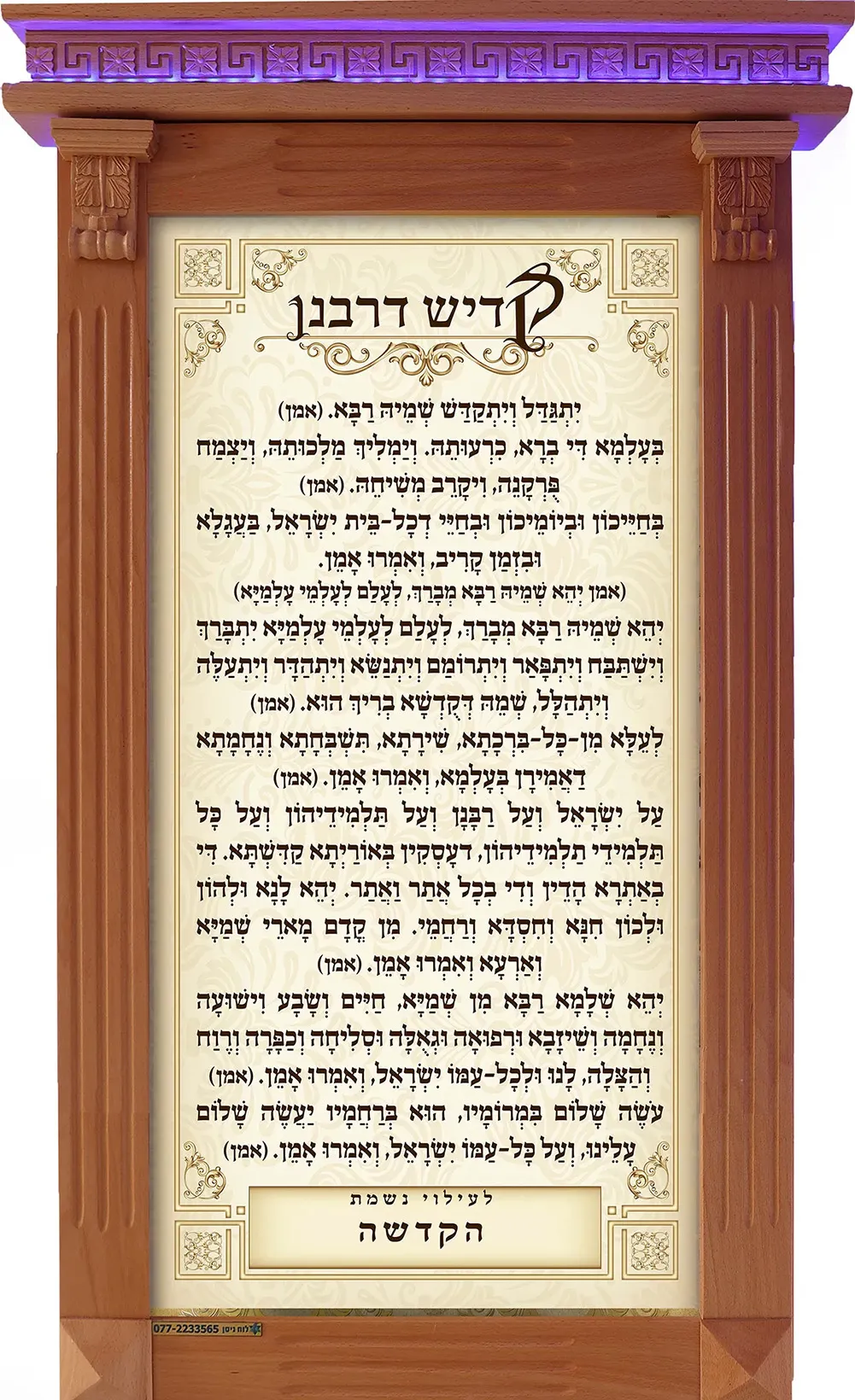 שלט לבית כנסת ‘קדיש נוסח ספרד’ עם אפשרות לשלוש סוגי מסגרות ושלושה צבעי לדים.