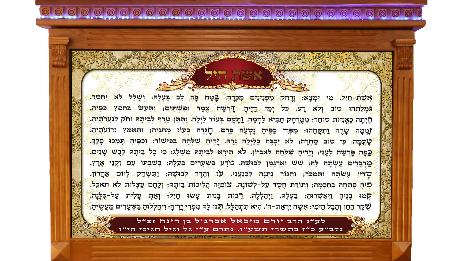 שלט אשת חיל מואר מדהים, עם אופציה לשלוש סוגי מסגרות – מסגרת בוק פאר , מסגרת עץ הדר או מסגרת זכוכית. ישנה אפשרות לבחור את צבע העץ, מגיע עם תוספת לד בצבעים כחול/צהוב/לבן לבחירה. בתחתית מסגרת בוק פאר ישנה אפשרות להנצחת נפטר. מוצר מבית לוח ניסן של שלטים לבית כנסת, הגדלים המוצגים הם הסטנדרטים, ישנה אפשרות להתאמה אישית לשלט לכל גודל שתבחרו, כמו כן התאמות בשילוט לכיתוב שונה לפי מנהגי בית הכנסת.