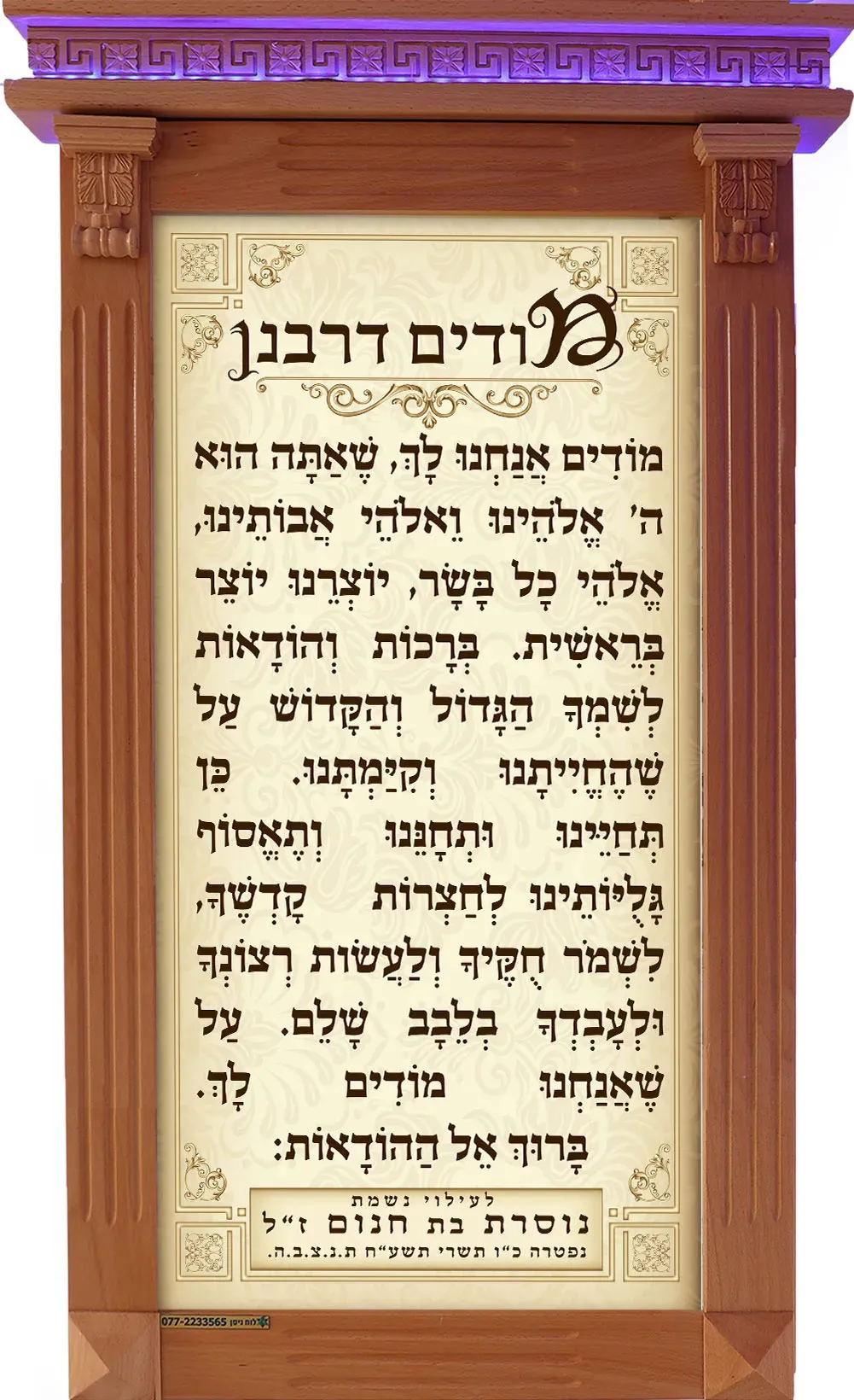 שלט לבית כנסת 'מודים דרבנן תפארת' עם אפשרות לשלוש סוגי מסגרות ושלושה צבעי לדים.