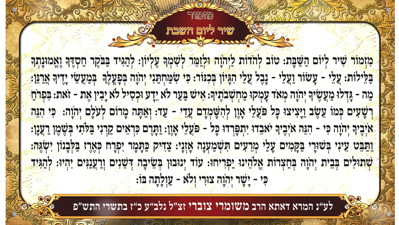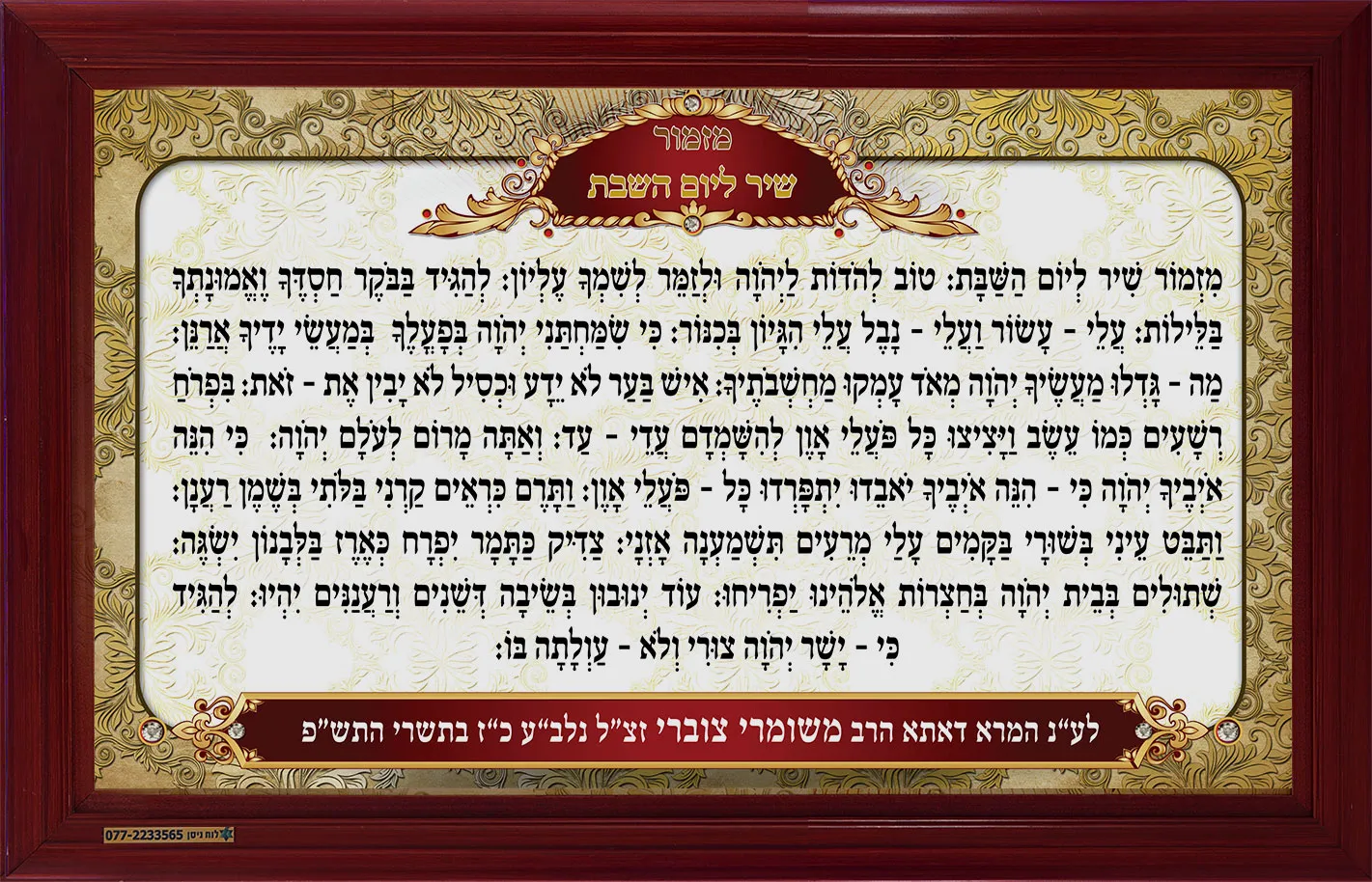 שלט מזמור שיר ליום השבת קלאסי מואר מדהים, עם אופציה לשלוש סוגי מסגרות – מסגרת בוק פאר , מסגרת עץ הדר או מסגרת זכוכית. ישנה אפשרות לבחור את צבע העץ, מגיע עם תוספת לד בצבעים כחול/צהוב/לבן לבחירה. בתחתית מסגרת בוק פאר ישנה אפשרות להנצחת נפטר. מוצר מבית לוח ניסן של שלטים לבית כנסת, הגדלים המוצגים הם הסטנדרטים, ישנה אפשרות להתאמה אישית לשלט לכל גודל שתבחרו, כמו כן התאמות בשילוט לכיתוב שונה לפי מנהגי בית הכנסת.