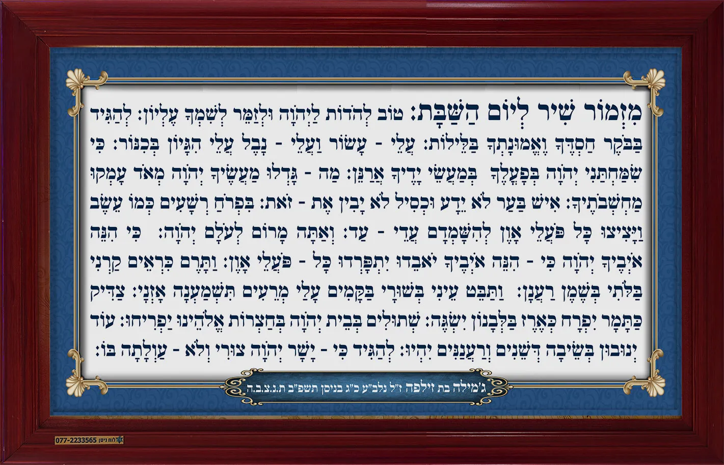 שלט מזמור שיר ליום השבת קלאסי מואר מדהים, עם אופציה לשלוש סוגי מסגרות – מסגרת בוק פאר , מסגרת עץ הדר או מסגרת זכוכית. ישנה אפשרות לבחור את צבע העץ, מגיע עם תוספת לד בצבעים כחול/צהוב/לבן לבחירה. בתחתית מסגרת בוק פאר ישנה אפשרות להנצחת נפטר. מוצר מבית לוח ניסן של שלטים לבית כנסת, הגדלים המוצגים הם הסטנדרטים, ישנה אפשרות להתאמה אישית לשלט לכל גודל שתבחרו, כמו כן התאמות בשילוט לכיתוב שונה לפי מנהגי בית הכנסת.