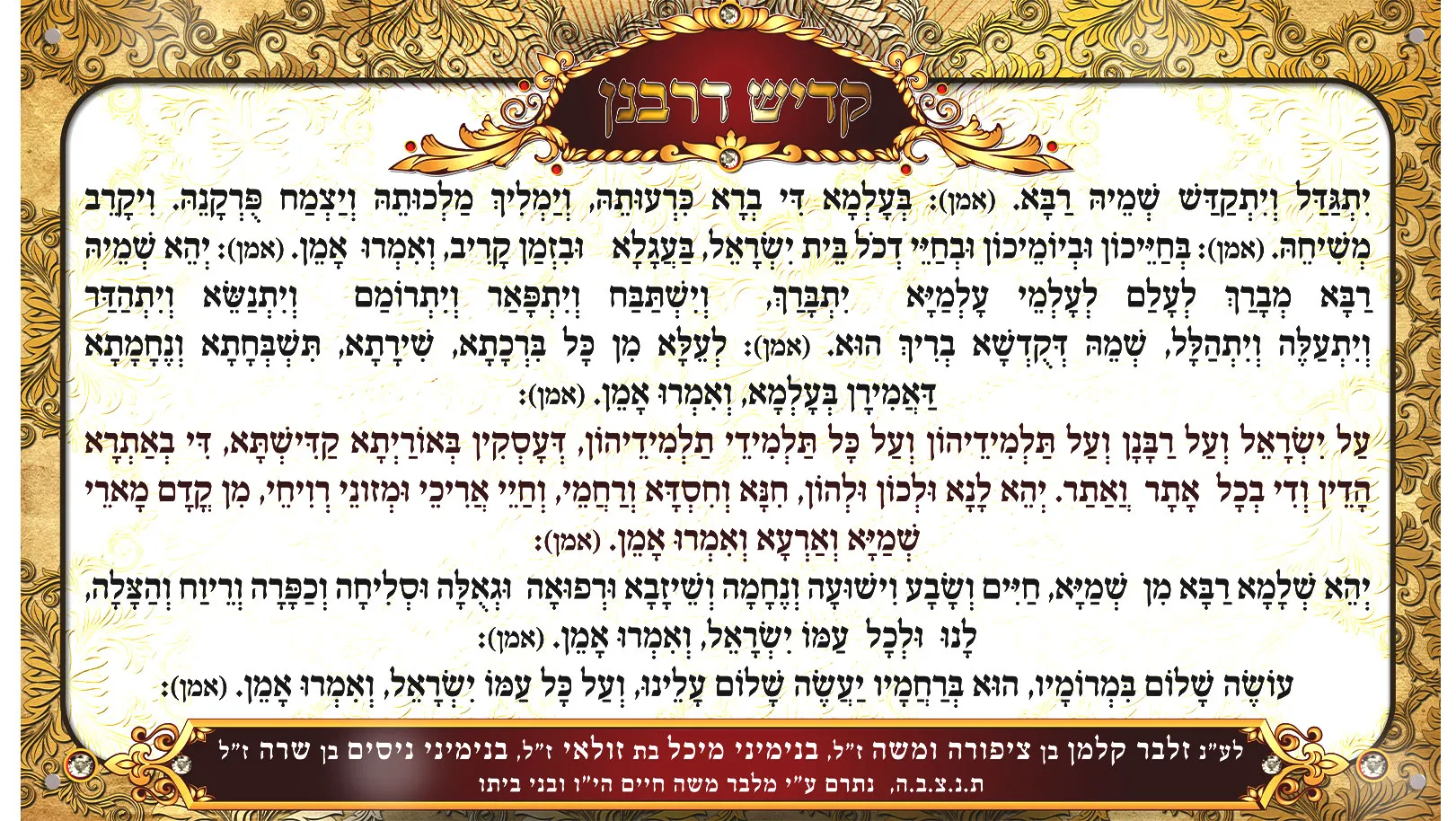שלט קדיש מואר מדהים, עם אופציה לשלוש סוגי מסגרות – מסגרת בוק פאר , מסגרת עץ הדר או מסגרת זכוכית. ישנה אפשרות לבחור את צבע העץ, מגיע עם תוספת לד בצבעים כחול/צהוב/לבן לבחירה. בתחתית מסגרת בוק פאר ישנה אפשרות להנצחת נפטר. מוצר מבית לוח ניסן של שלטים לבית כנסת, הגדלים המוצגים הם הסטנדרטים, ישנה אפשרות להתאמה אישית לשלט לכל גודל שתבחרו, כמו כן התאמות בשילוט לכיתוב שונה לפי מנהגי בית הכנסת.